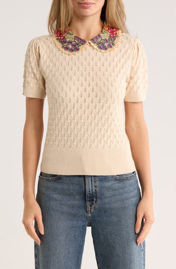 A bright, floral embroidered Peter Pan collar frames this charming short-sleeve sweater knit with airy pointelle stitches.