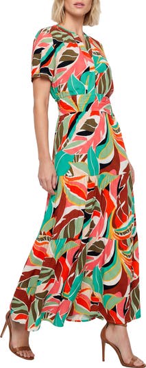 A vibrant leaf print brings tropical vibes to a short-sleeve maxi dress fashioned with a smocked waist and tiered silhouette for breezy style.