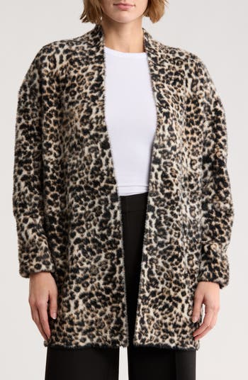 This faux-fur open‑front cardigan with patch pockets wraps you in plush texture and cozy ease.