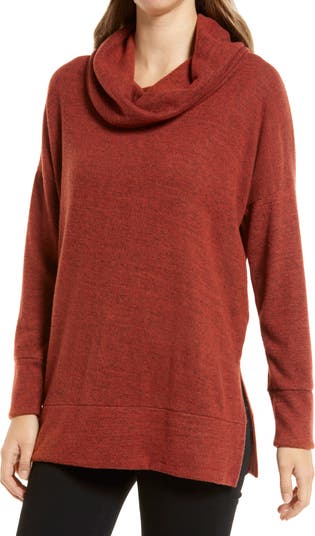 When your schedule calls for nothing but kicking back, do it wearing this cozy, brushed cowl-neck top, cut with side slits for easy movement.