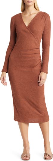 A long-sleeve midi dress crafted from a soft, stretchy ribbed knit features flattering side ruching in a faux-wrap silhouette.