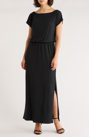 Perfect to dress up or down, this cap-sleeve maxi is framed by an elegant bateau neck and alluring side slit.