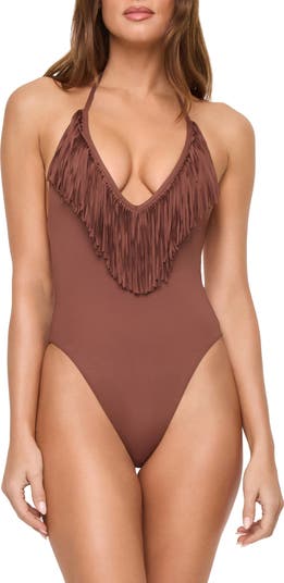 A fringe overlay brings lots of drama to this one-peice fashioned with a flirty tie back and cheeky back coverage.