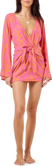 A breezy faux-wrap silhouette lends beachy flair to this lightweight cover-up dress framed by long bell sleeves and designed with a cute tie-front detail.