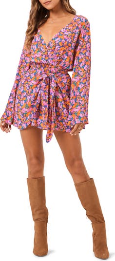 Long sleeves frame this cover-up dress patterned in bright blooms and adorned by waist ties that let you wrap up comfortably.