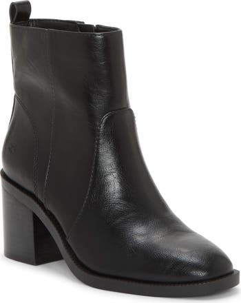 A stacked block heel lofts your look to new heights when you don this bootie shaped from smooth faux leather.
