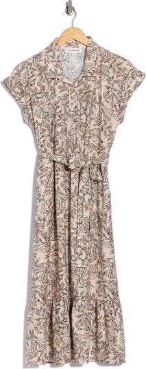 Elevate your off-duty ensembles with this midi-length shirtdress covered in sandy monstera leaves and cinched with a tie belt.