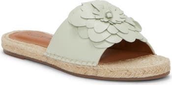 A layered floral appliqué makes a sophisticated statement on a classic slide sandal complete with espadrille-inspired trim.