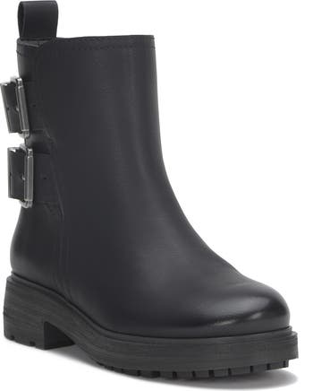 Add a touch of trendy edge to any look with a bold lug-sole boot fashioned with a side zipper and secured by double gleaming buckles.
