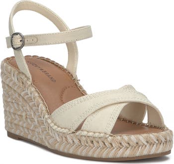 Espadrille-inspired braiding highlights the wedge heel of a standout casual sandal topped with a slim ankle strap.
