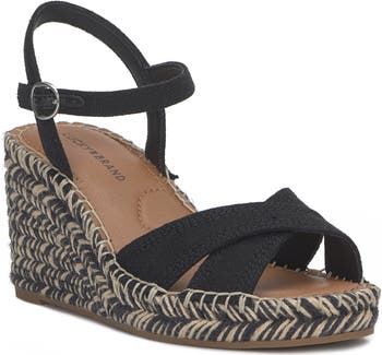 Espadrille-inspired braiding highlights the wedge heel of a standout casual sandal topped with a slim ankle strap.