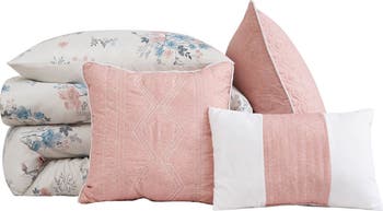 Pretty blooms give modern sophistication to a cuddly comforter set complete with shams and decorative pillows to transform your bedroom decor.