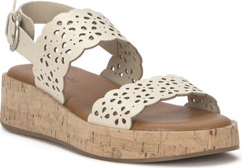 Scalloped edges and flower-shaped laser cutouts emphasize the warm-weather charm of this leather sandal lifted by a cork-wrapped wedge.