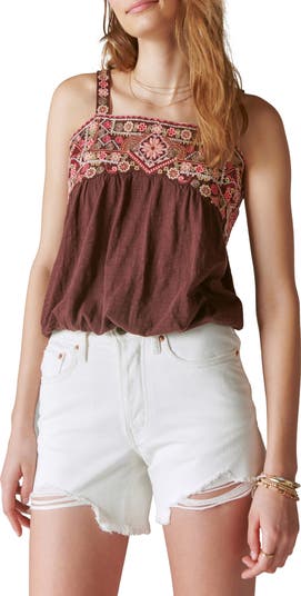 Decorative floral embroidery details the neckline of a breezy tank with a bubble-style silhouette perfect for warmer days.