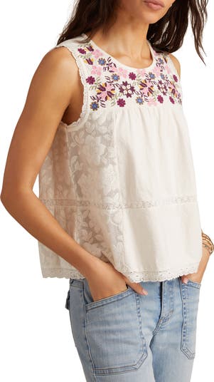 Embroidered botanicals and lacy armholes sweeten a breezy tank made from lightweight and breathable cotton .