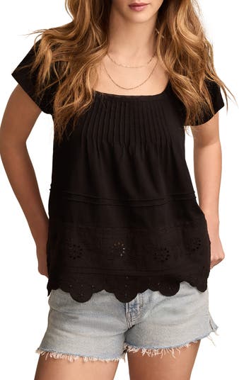 Dainty pintucks and airy embroidered eyelets detail a square-neck top made from cotton-and-modal and edged in scallops for a sweet finish.