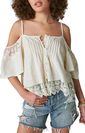 A lacy, scalloped hemline amplifies the boho-chic effect of a cold-shoulder top complete with pintuck pleats.