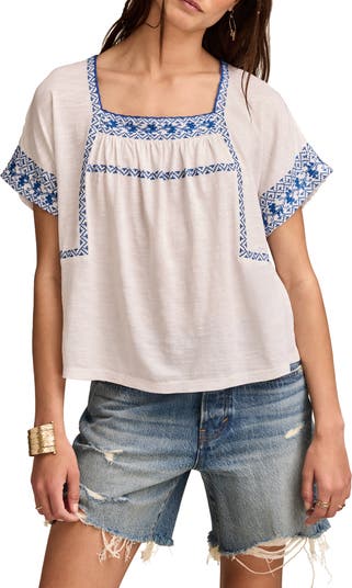 Embroidered Short Sleeve Cotton Peasant Top