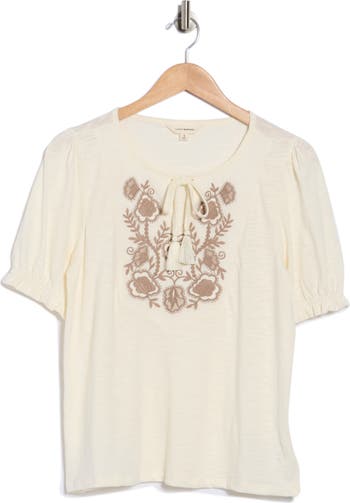 This short-sleeve top features a split neckline with tassel ties and floral embroidery for artisanal charm.