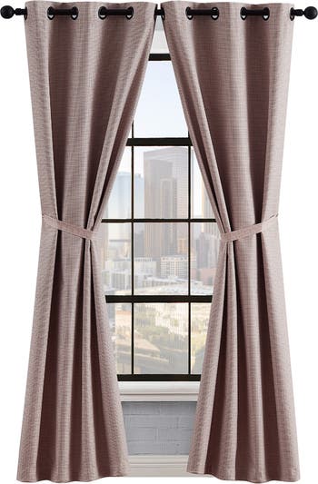 Wispy, blackout curtains are cut from patterned textured fabric to add elegance to your home. Each panel pair also includes 2 matching tie backs with loops that can easily be tied together or used with a curtain hook (hooks sold separately).