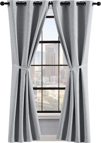 Wispy, blackout curtains are cut from patterned textured fabric to add elegance to your home. Each panel pair also includes 2 matching tie backs with loops that can easily be tied together or used with a curtain hook (hooks sold separately).
