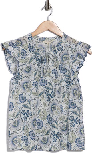 A floral print and scalloped flutter sleeves enhance the charm of this lightweight cotton top that's perfect for warm days.