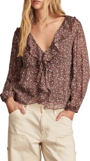 Wildflowers dot an airy crepe top fashioned with an inverted Empire waist and cascading ruffles for a sweet and easygoing look.
