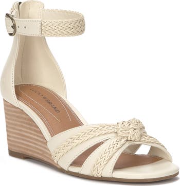 Braided straps further the warm-weather styling of this ankle-strap sandal lofted by a stacked wedge heel.