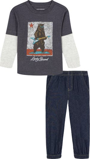 A cool bear jams out on a guitar on this graphic T-shirt that's paired with some joggers that'll keep your kiddo comfy as they run from the playground to class.