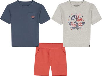 Let your kid mix and match with this three-piece set including two logo graphic T-shirts and comfortable pull-on shorts.