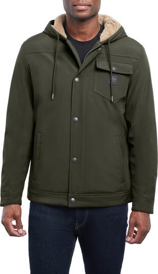 Look cool; stay warm; repeat all season long with this hooded, soft-shell jacket lined in cozy faux shearling.