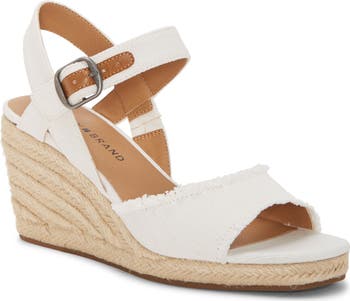 A canvas band with frayed edges adds to the breezy style of a quarter-strap sandal set on a jute-wrapped wedge.