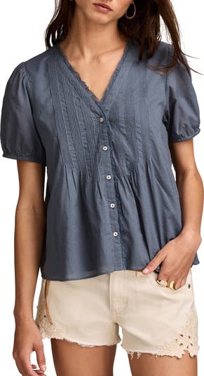 Crisp pintucks texture this breezy cotton top framed by charming puff sleeves and trimmed with lovely lace.