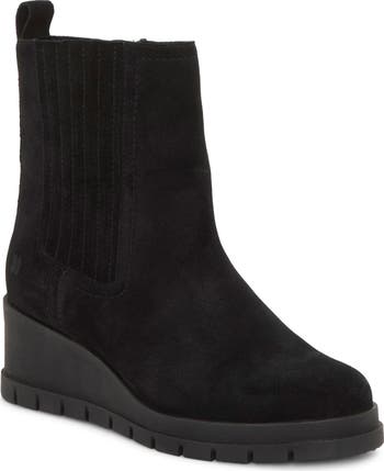 A hidden goring side panel provides comfortable wear on a supple suede bootie grounded by a chunky wedge heel and rubber lug sole.