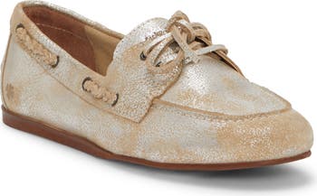 A crinkled metallic finish gives shimmer and shine to this leather boat shoe built atop a grippy rubber sole to increase the traction of your every stride.