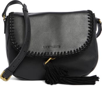 Whipstitched suede trim and tassels boost the Western-chic style of this compact crossbody bag featuring a top-flap closure and exterior slip pockets.