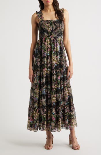 A black background showcases the dreamy bloooms tumbled across a frothy maxi fitted with a sweetly smocked bodice.