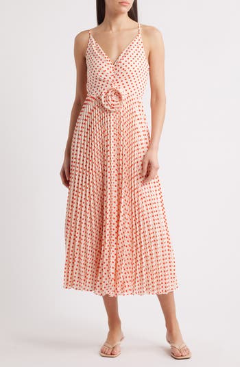 A romantic rosette blooms at the center of this sleeveless maxi punctuated with a pleat-trimmed skirt for graceful movement.