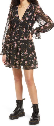 Romantic flowers float around a clip-dot–chiffon dress in a versatile button-front silhouette with semi-sheer long sleeves and voluminous ruffled cuffs.