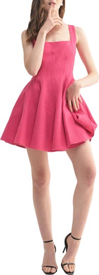Vertical seams sculpt the fit-and-flare silhouette of this charming minidress crafted from woven bouclé fabric and accentuated by a classic square neckline.