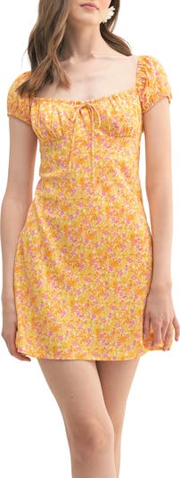 Charming flowers blossom over a minidress accented with a dainty bow that frames the gathered sweetheart bust.