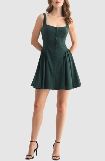 An elegant square neckline and trend-favorite Basque waist define the bodice of this fit-and-flare minidress.