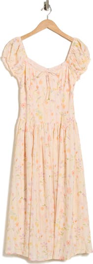 A whimsical floral print and dainty bow bring instant charm to this cap-sleeve midi dress fashioned in a fit-and-flare silhouette.