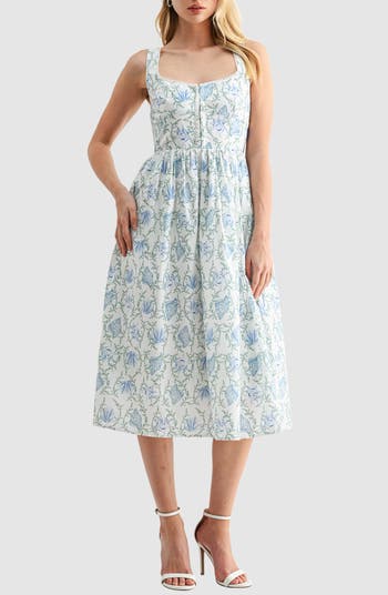 A fitted, corset-inspired bodice balances a flowy A-line skirt on this lightweight cotton sundress fashioned with a charming floral print.