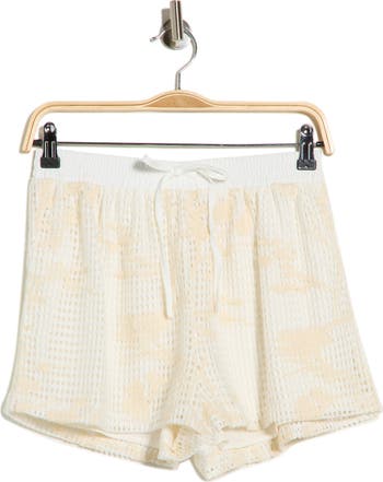 Embroidered flowers boost the sunny-day charm of these latticed mesh shorts framed by a comfy elastic-drawstring waist.