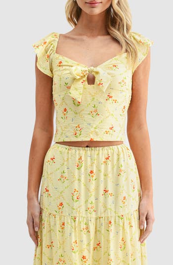 Celebrate the season in a charming cropped top framed by flutter sleeves, a keyhole and front knot and formed to your figure with a softly smocked back panel.