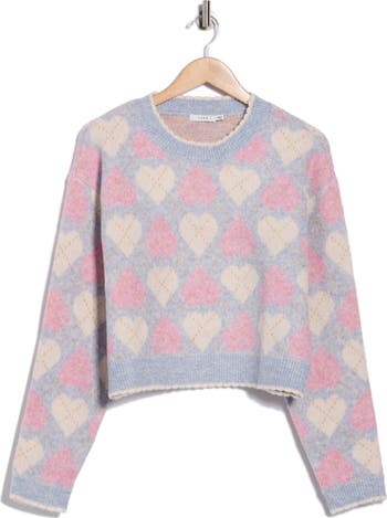 Dainty scallops and argyle hearts sweeten this cozy double-knit sweater fashioned in a slouchy, cropped silhouette for easy layering.