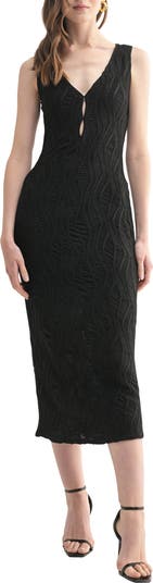 Two small keyholes define the V-neckline of a figure-loving midi dress crafted from a rich wavy textured knit for standout style.