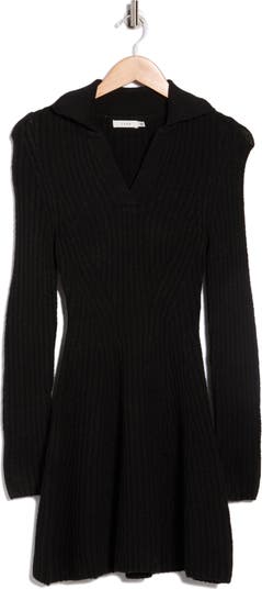 A johnny collar brings retro charm to this cozy ribbed sweater-dress knit in a fit-and-flare silhouette.