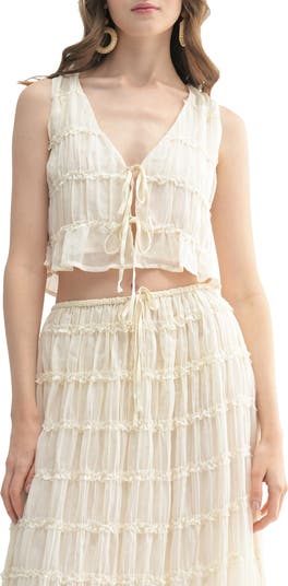 Twin ties tether the front of this sleeveless V-neck top that's detailed with ruffles for a romantic touch.